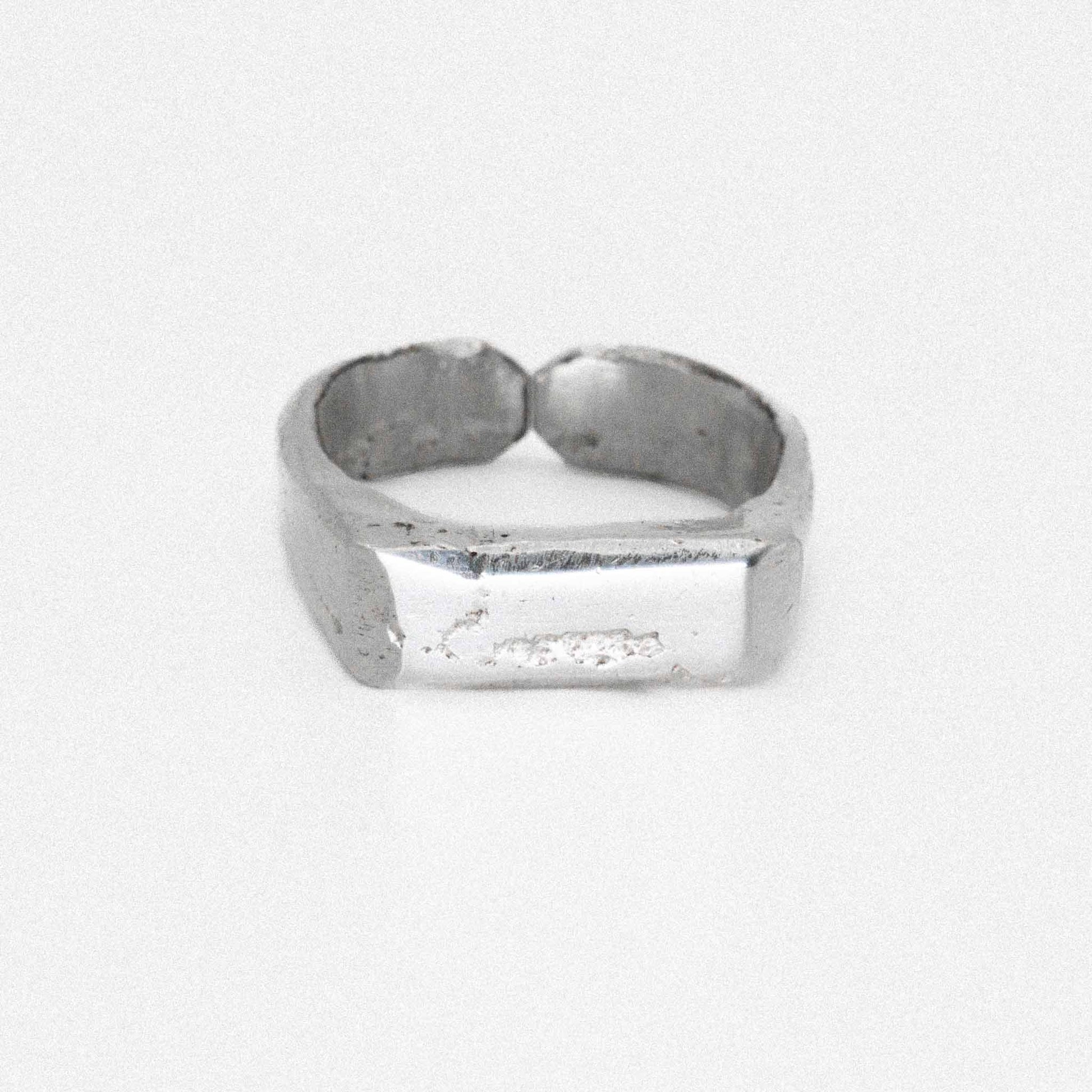Gefertigt aus 925er Sterling Silber, mit offener Ringschiene. Die Kanten sind leicht abgerundet, die Oberfläche teils hochglanzpoliert, teils roh belassen.