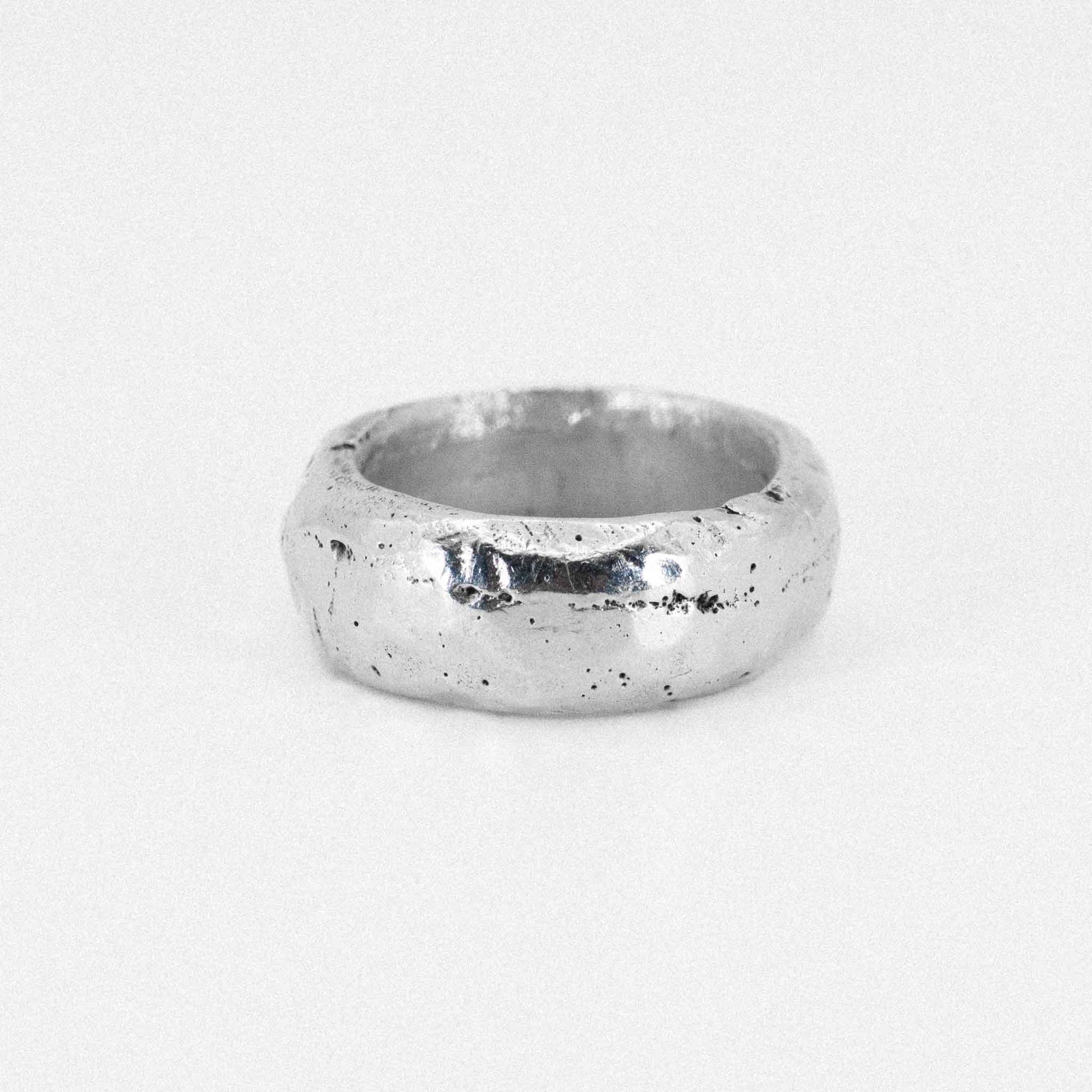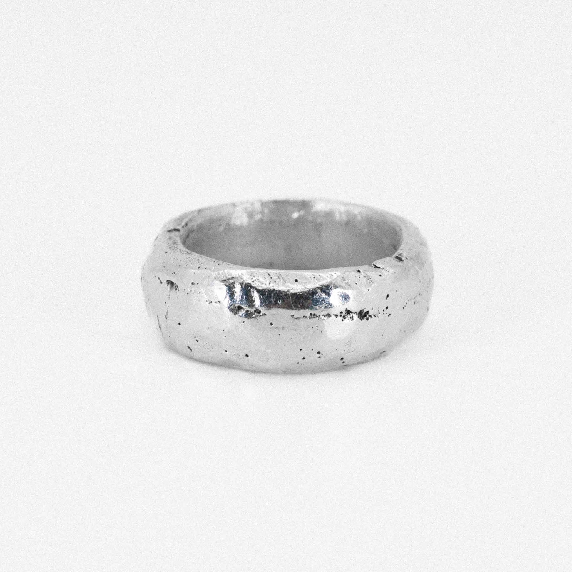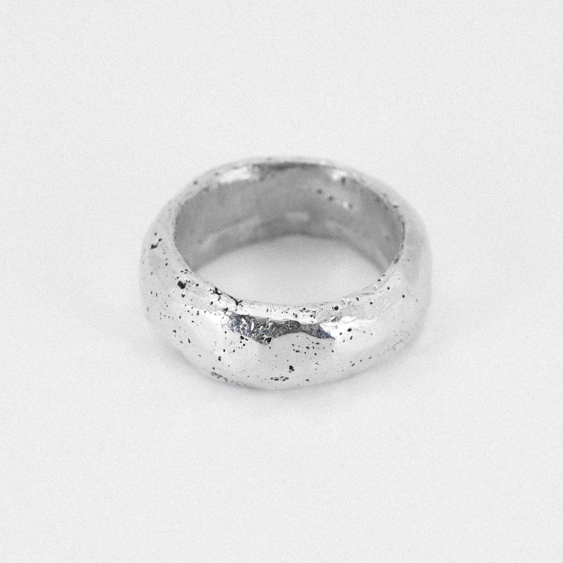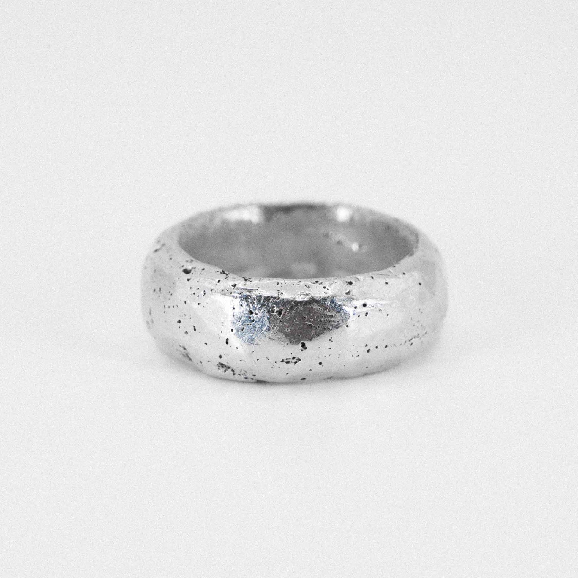 Dieser Silberring ist kraftvoll und schlicht zugleich. Seine runde Form wird durch kleine Vertiefungen und Gussstrukturen gebrochen, die ihm einen rohen und markanten Charakter verleihen. Ein Ring, der bewusst nicht perfekt ist. Gefertigt aus 925er Sterling Silber in Sandguss-Technik.