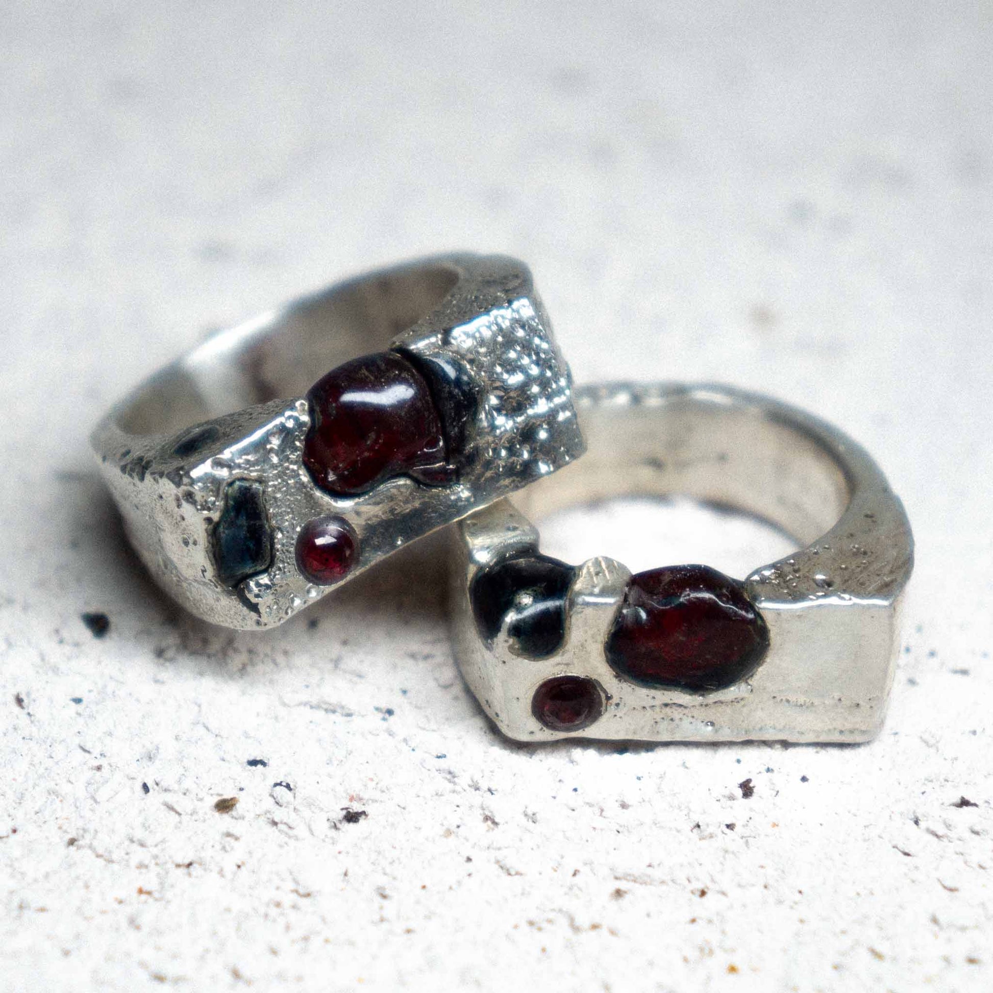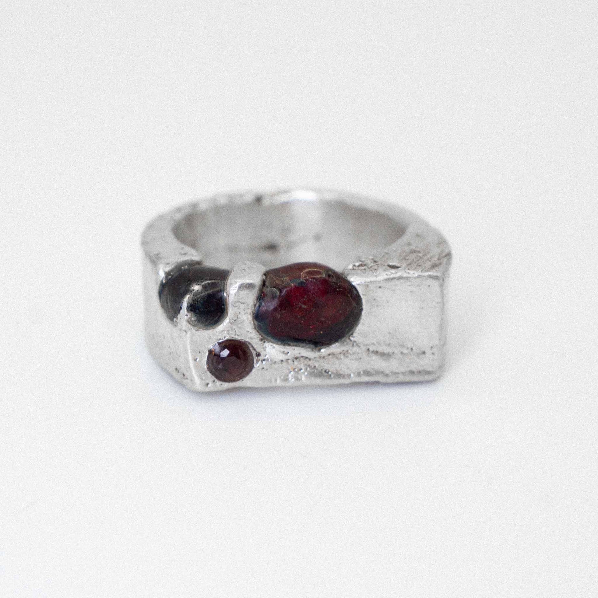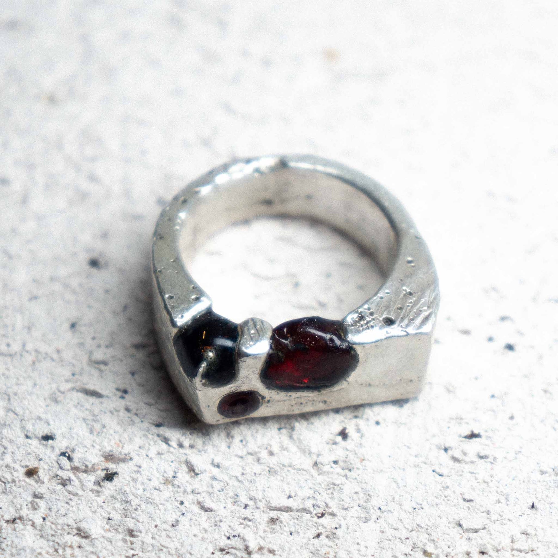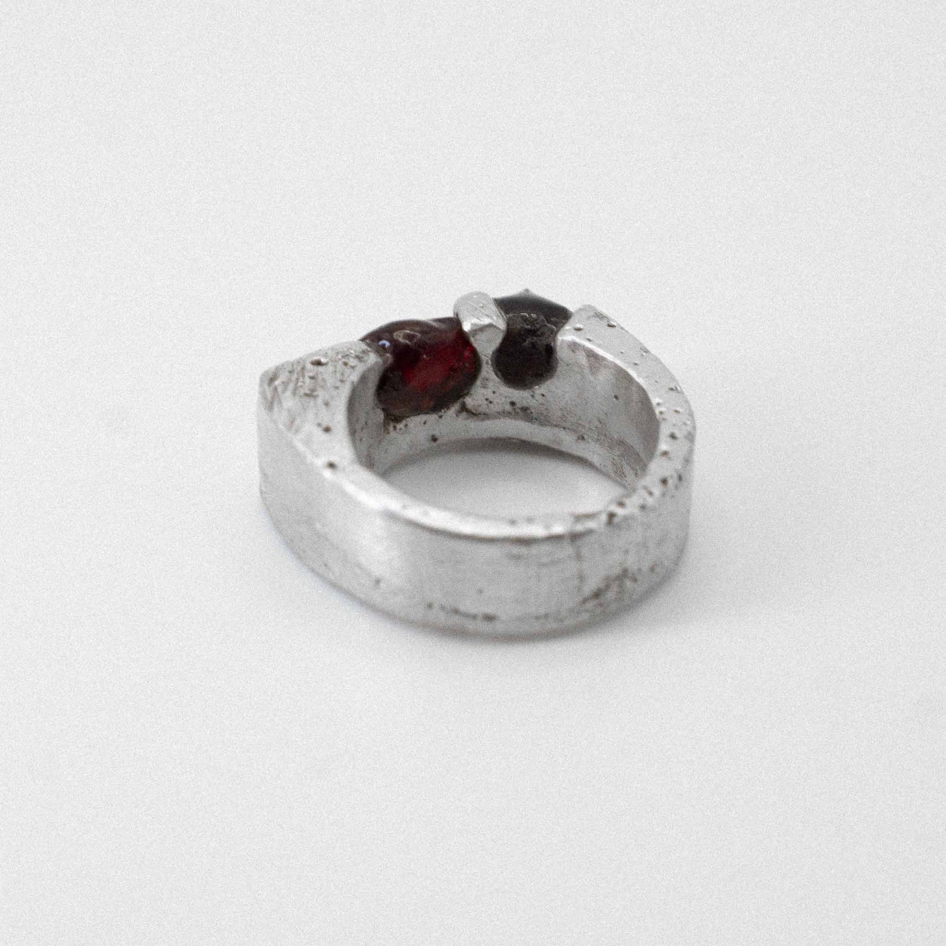 Aus massivem 925er Sterling Silber gefertigt. Zwei rote Glassteine sind direkt in das Metall eingegossen und fest mit dem Ring verbunden. Daneben sitzt ein präzise geschliffener Granat in tiefem Rot, der das Licht reflektiert.