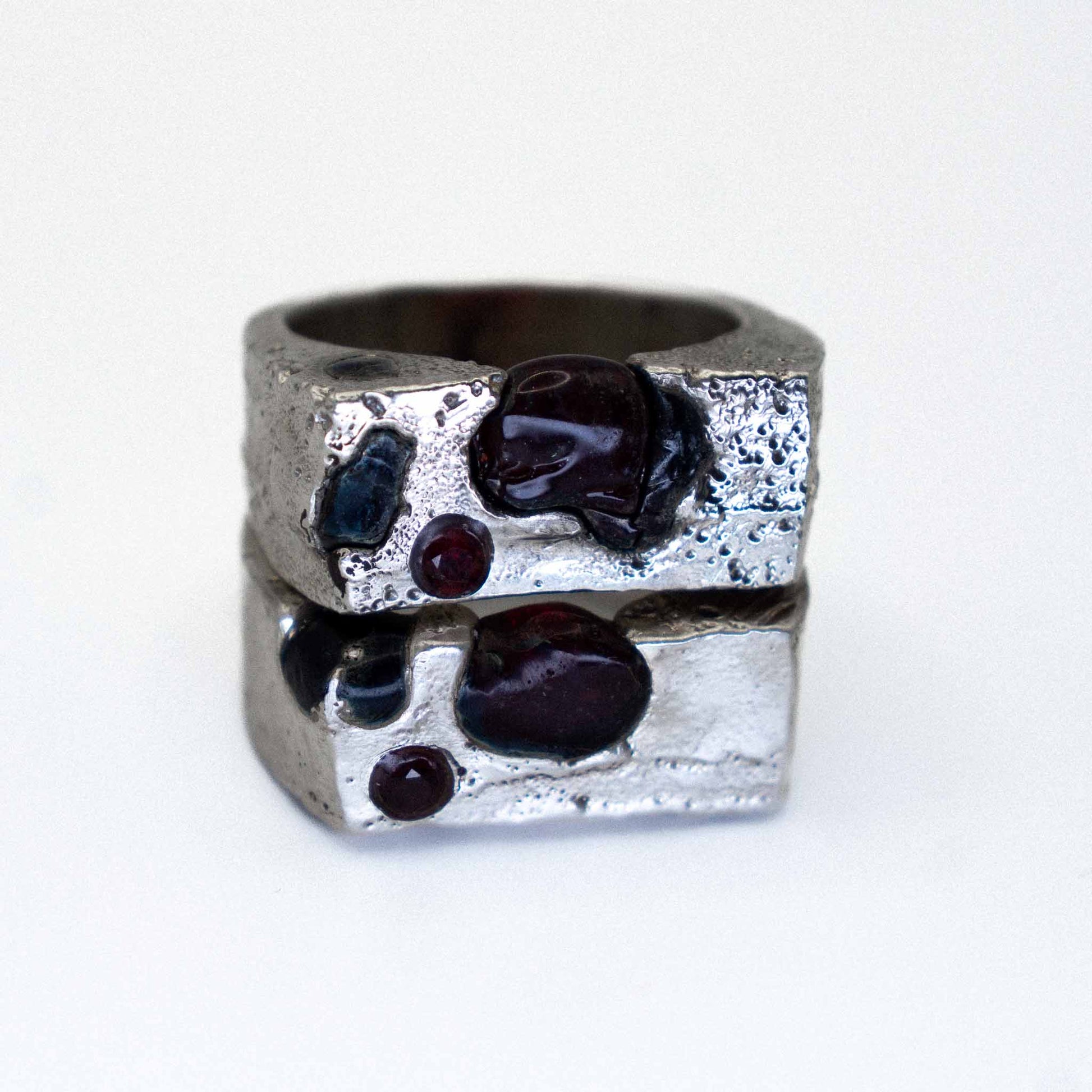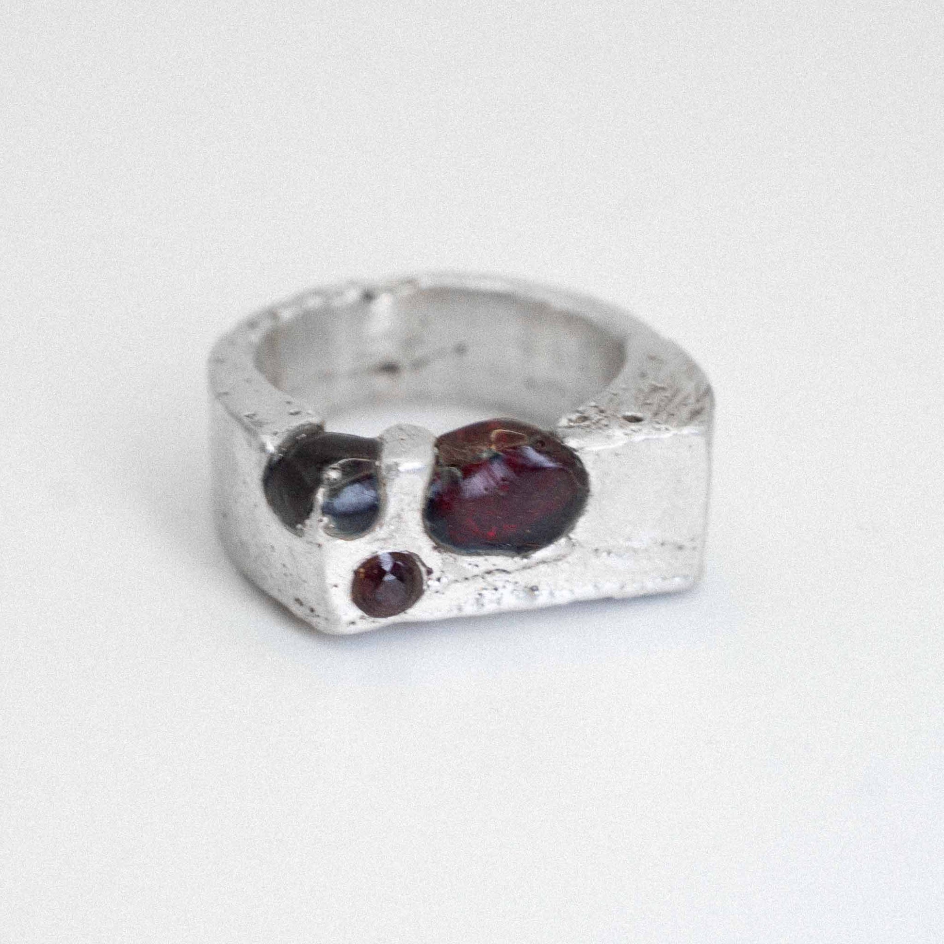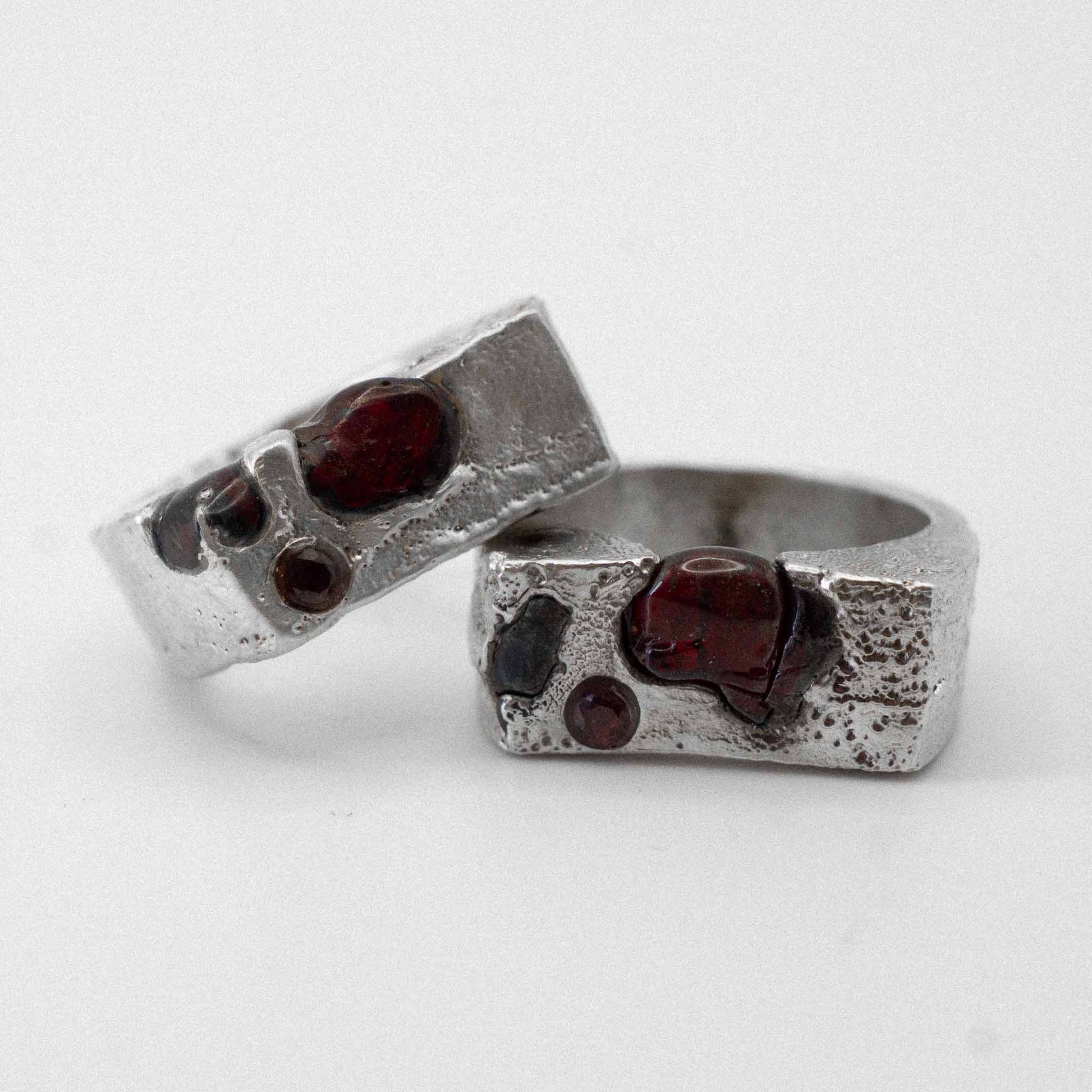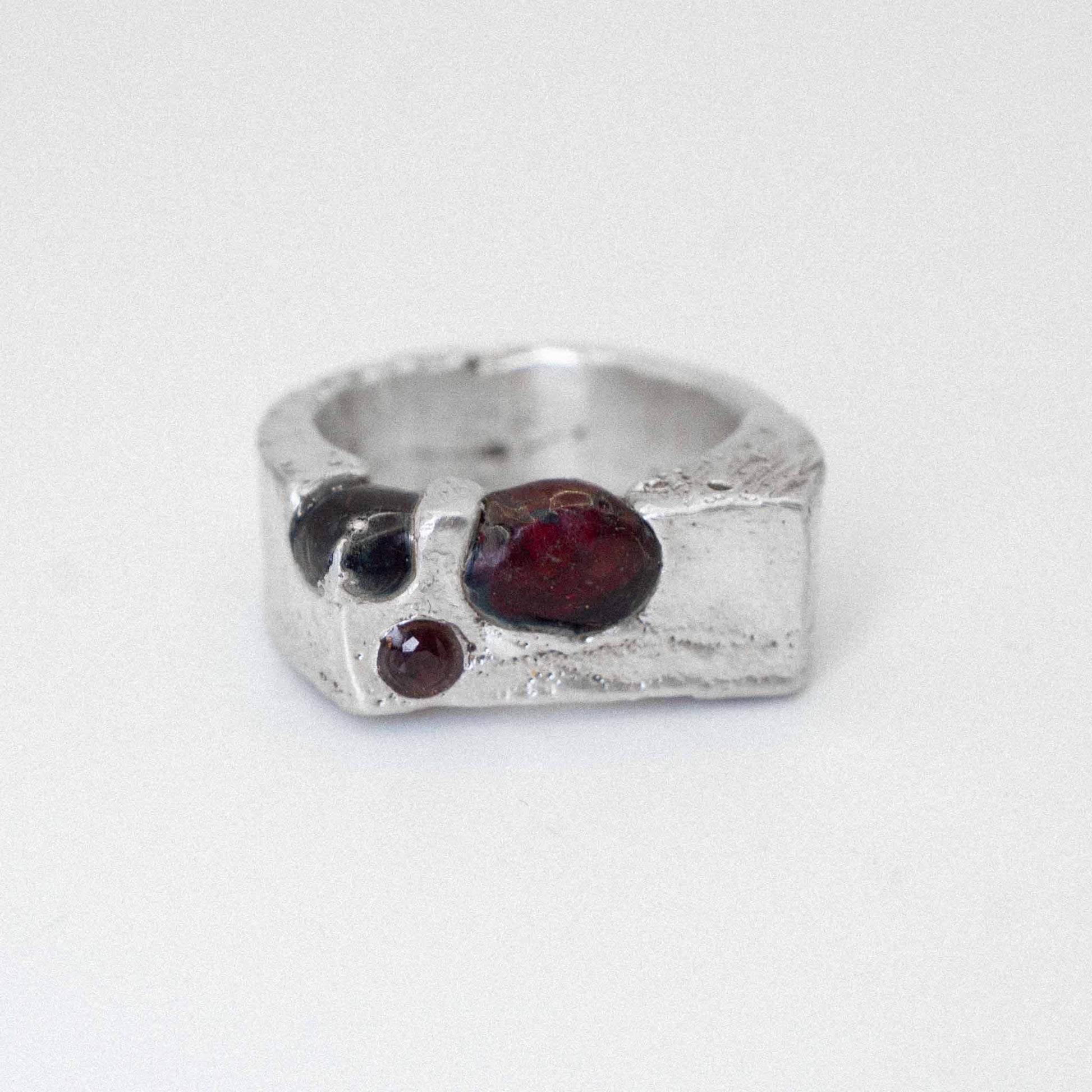Aus massivem 925er Sterling Silber gefertigt. Zwei rote Glassteine sind direkt in das Metall eingegossen und fest mit dem Ring verbunden. Daneben sitzt ein präzise geschliffener Granat in tiefem Rot, der das Licht reflektiert.