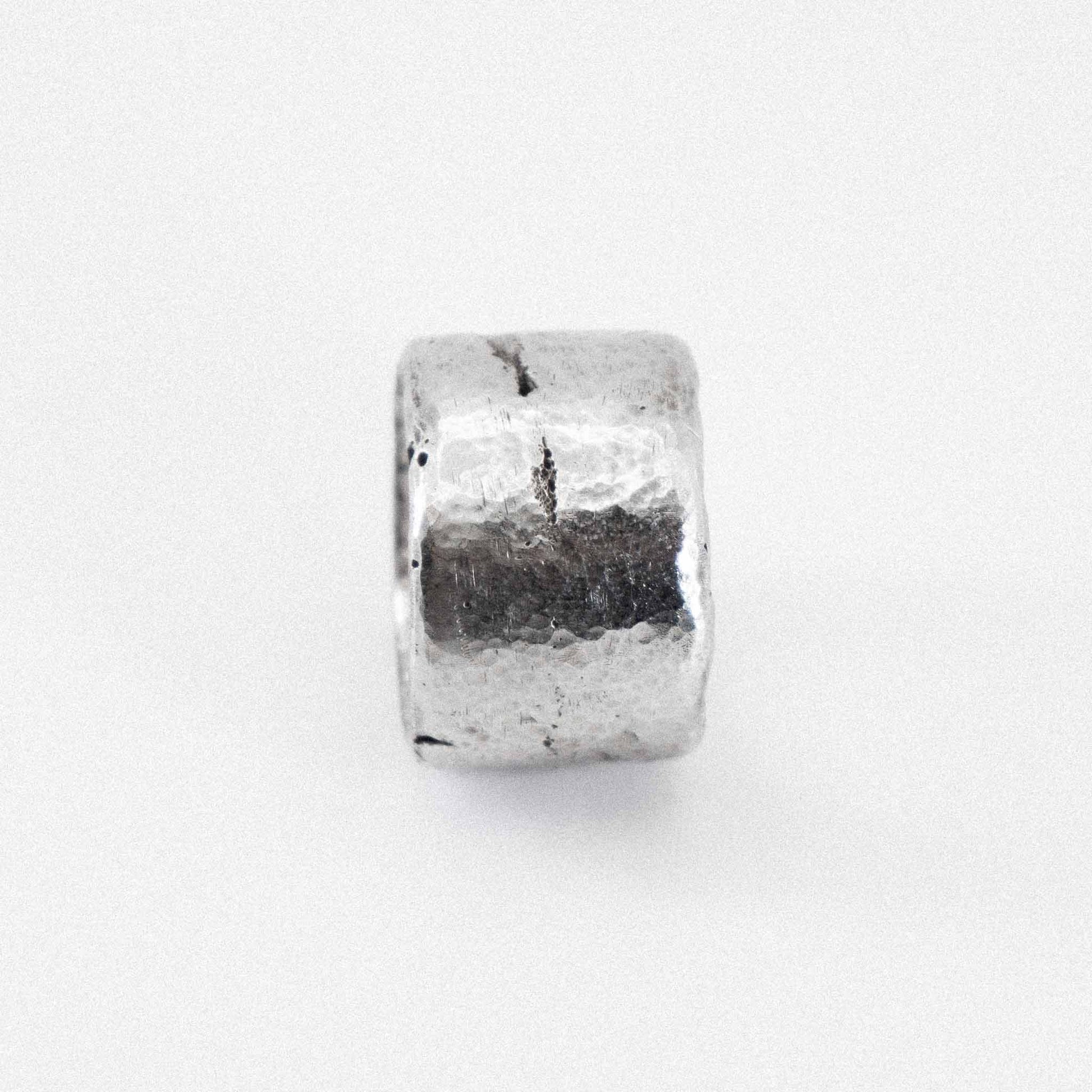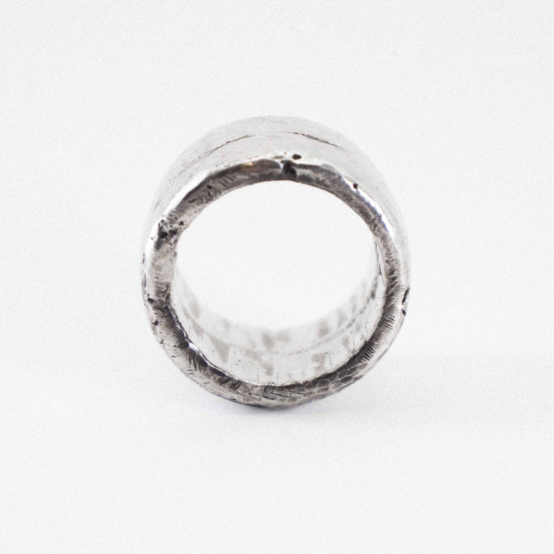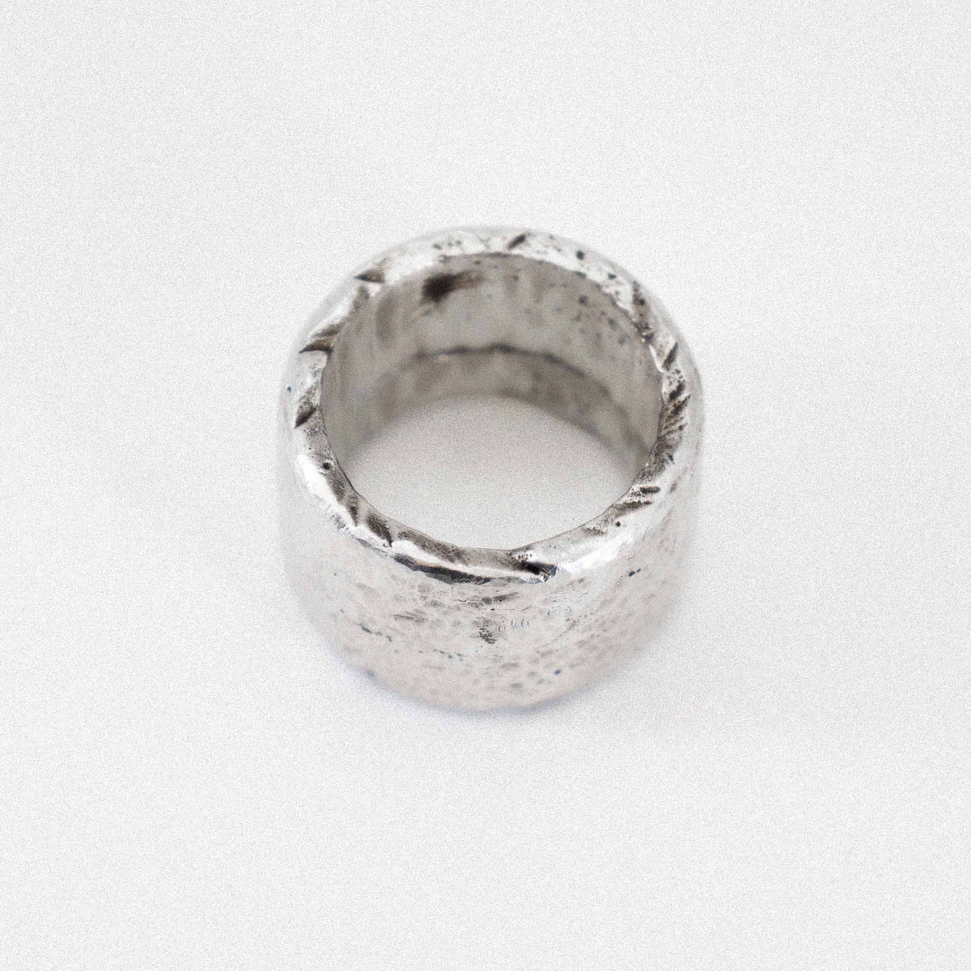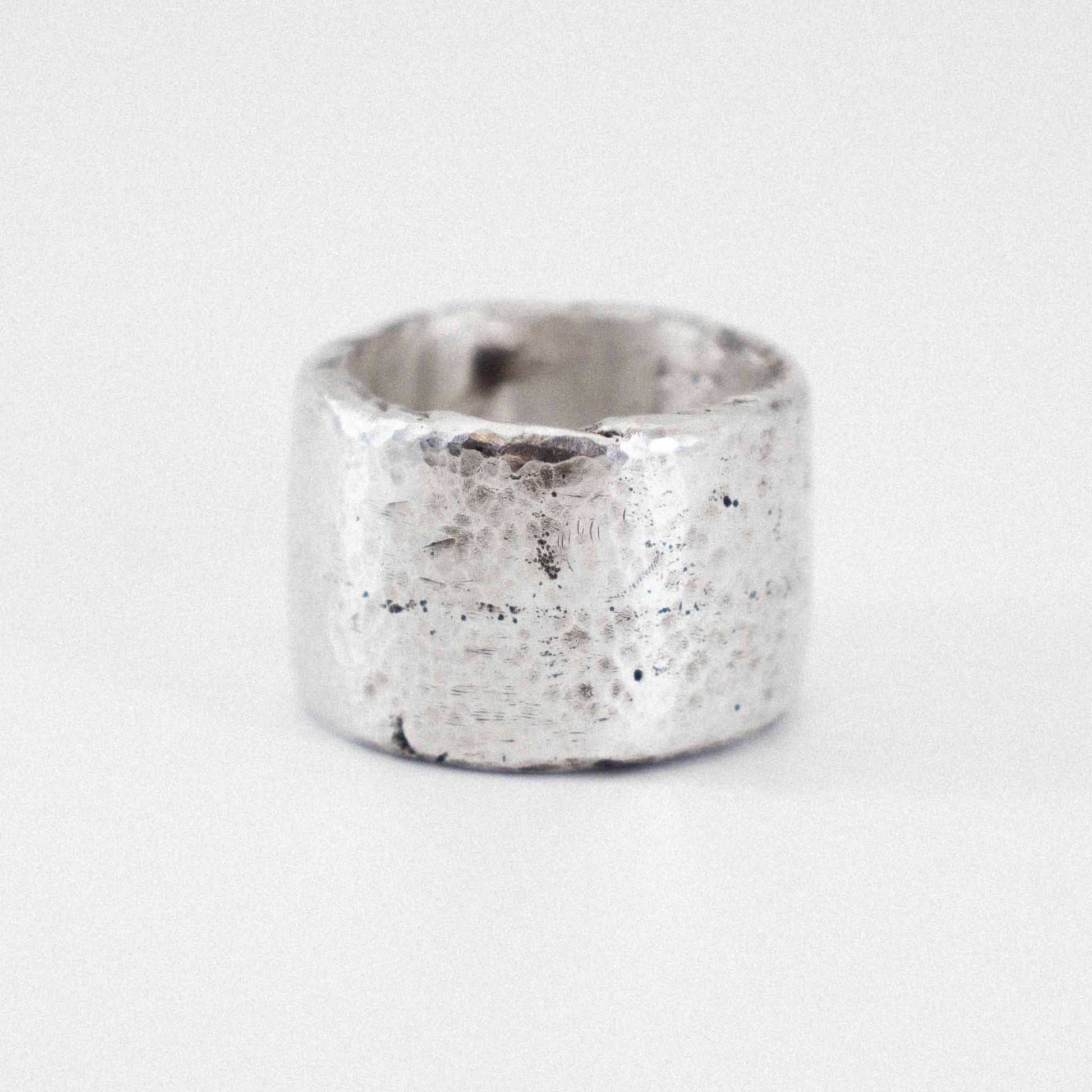 Aus 999er Feinsilber geschmiedet, misst dieser massive Ring knapp 2 cm in der Breite und 2 mm in der Stärke. Sein Gewicht ist spürbar, sein Auftreten unübersehbar. Das dezente Hammer-Finish gibt ihm von Anfang an Charakter, doch er wird im Laufe der Zeit definitiv noch mehr davon entwickeln.